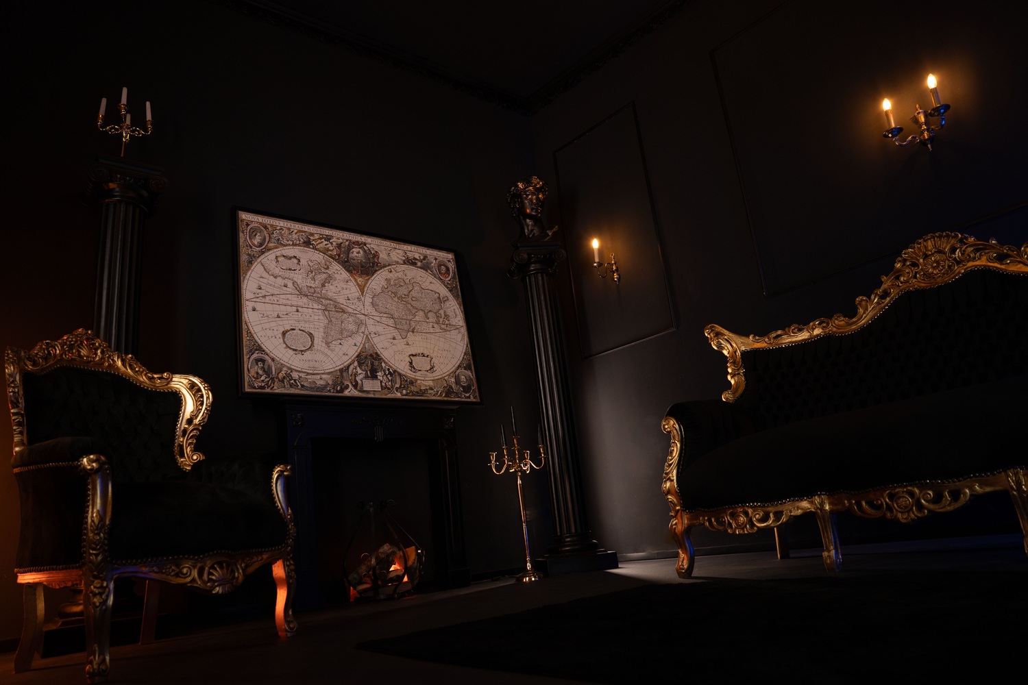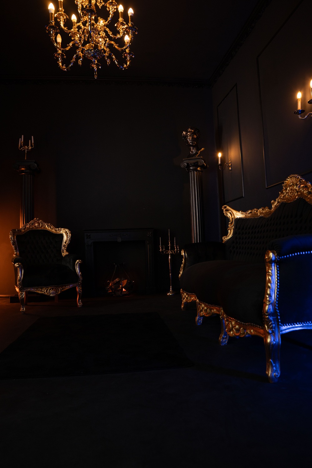 Das Barock Studio Black in Brühl bei Mannheim kombiniert schwarze Wände mit goldverzierten Möbeln, Kronleuchtern und Kamin – ein Setting voller Luxus und Dramatik.