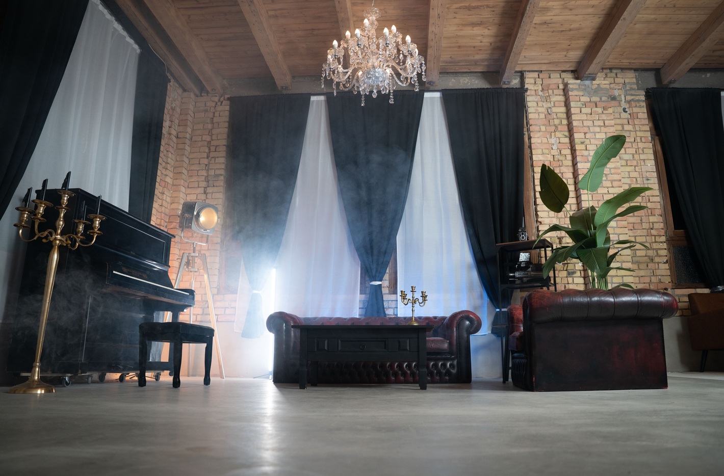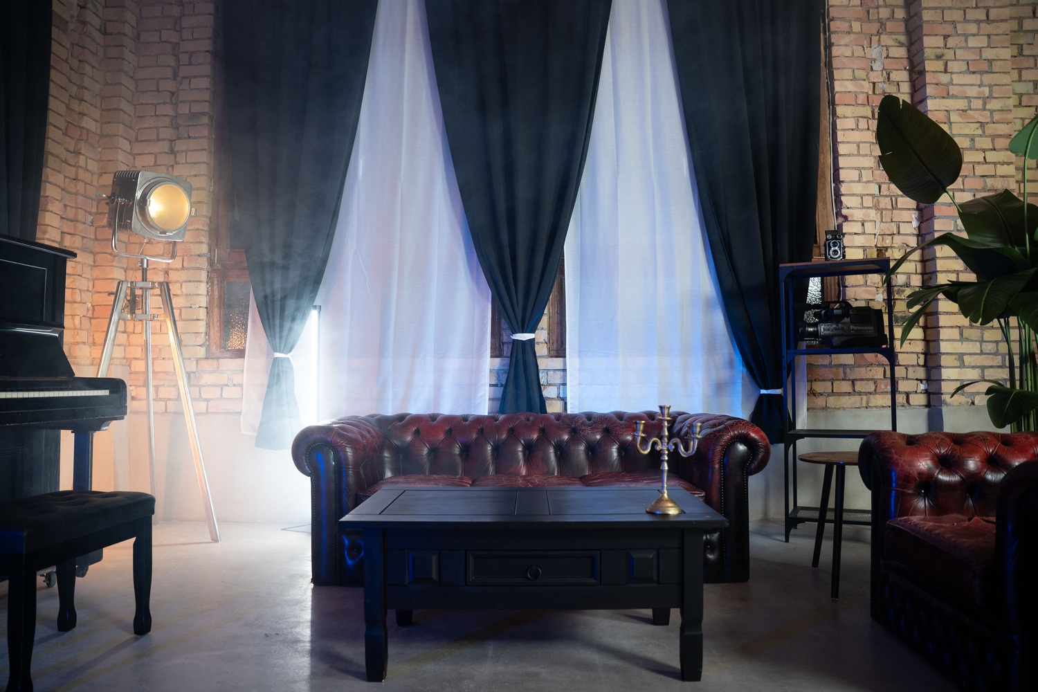 Unser Loft Vintage Studio in Brühl bei Mannheim & Heidelberg bietet dir eine einzigartige Kulisse im angesagten Industrial-Look. Mit roter Chesterfield Couch, edlen Sesseln, einem schwarzen Klavier und Backsteinwand sorgt dieser Raum für authentisches Loft-Feeling. Durch die großen Fenster strömt weiches Available Light ins Studio – ideal für natürliche Portraits, Lifestyle-Shootings oder stimmungsvolle Videoproduktionen.